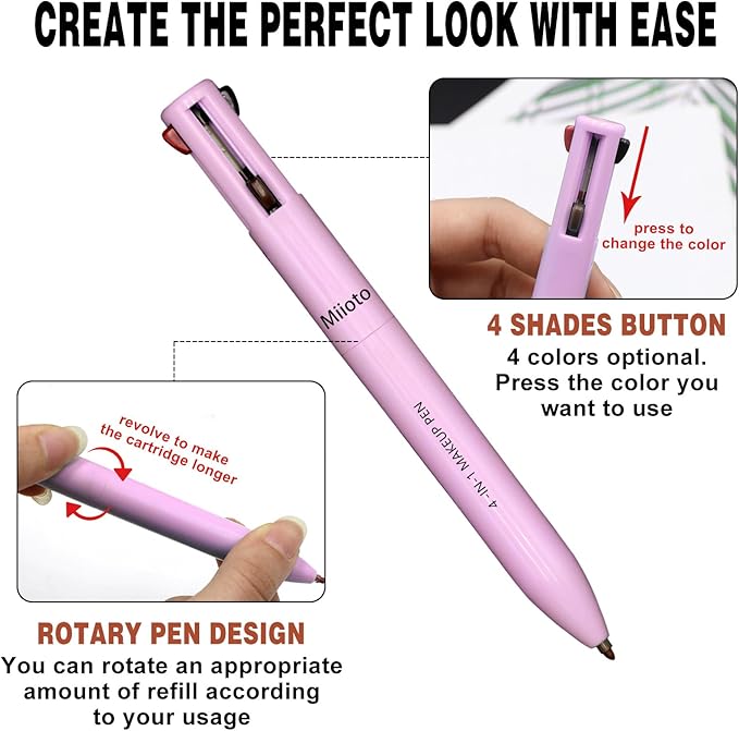 El diseño en forma de bolígrafos de maquillaje es muy adecuado para llevar, solo un lápiz cosmético puede completar el maquillaje delicado de cejas, maquillaje de ojos, maquillaje de labios y maquillaje destacado sin perder más tiempo💄. El maquillaje se puede lavar con un desmaquillador o un limpiador de aceite.